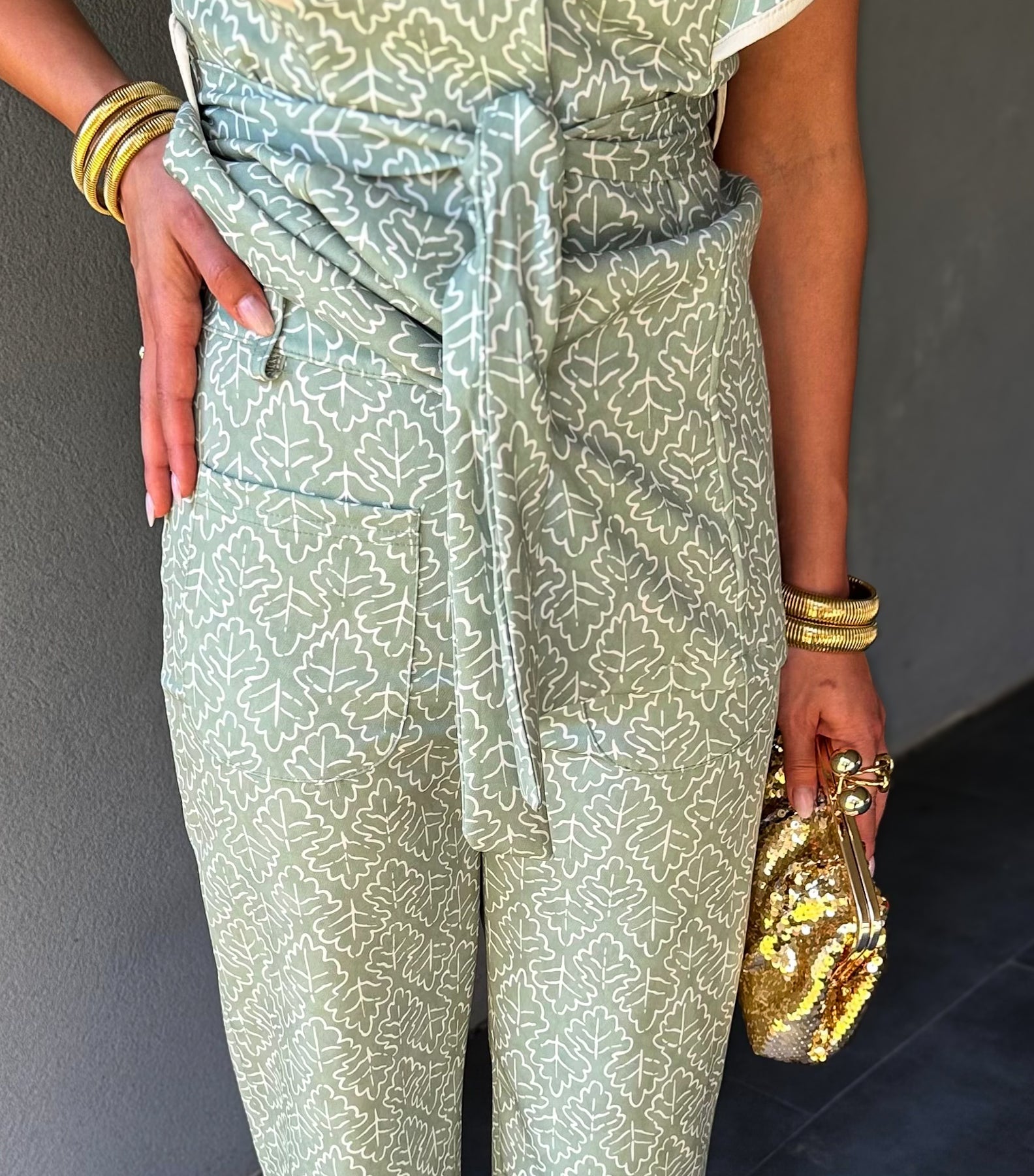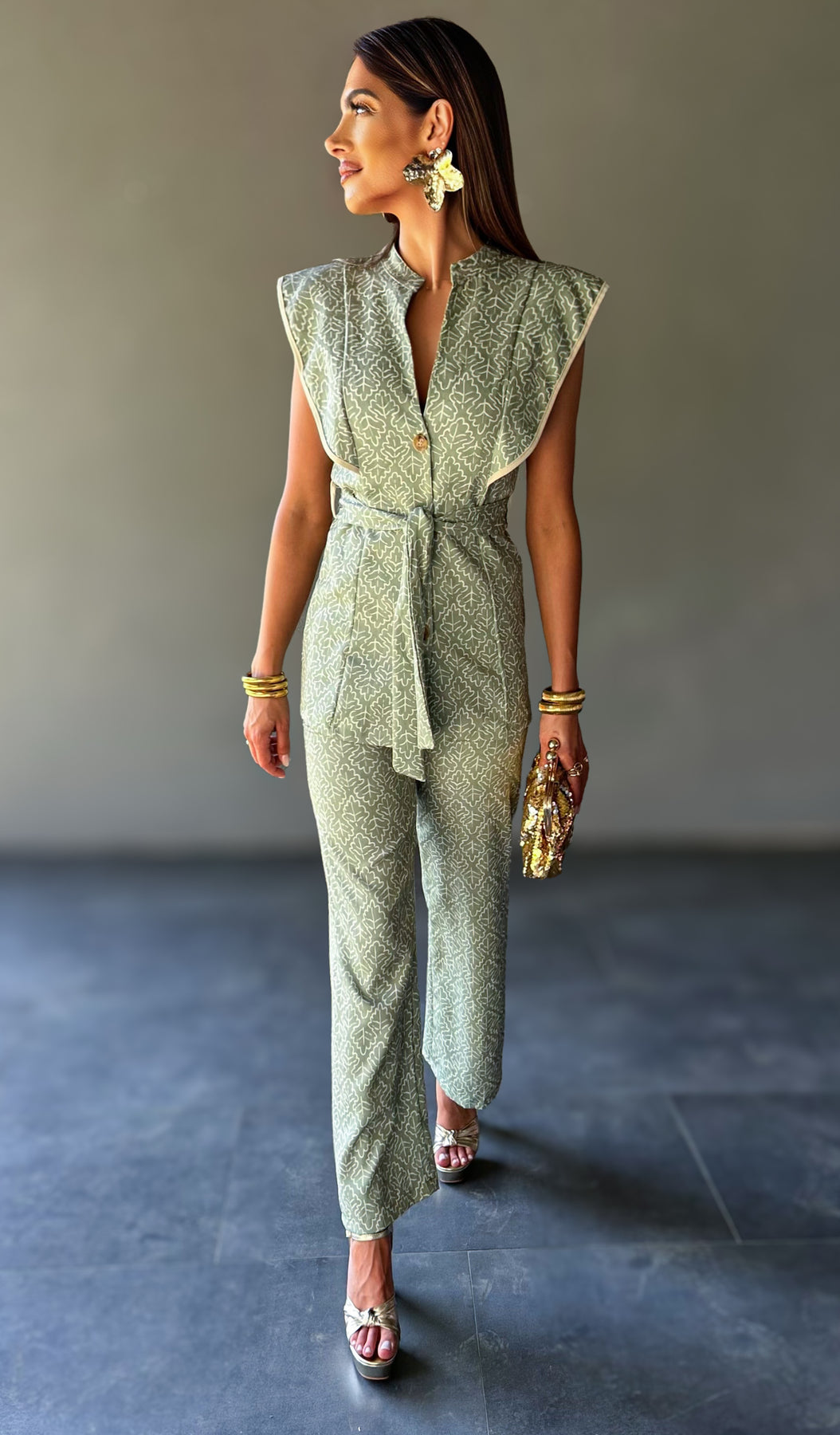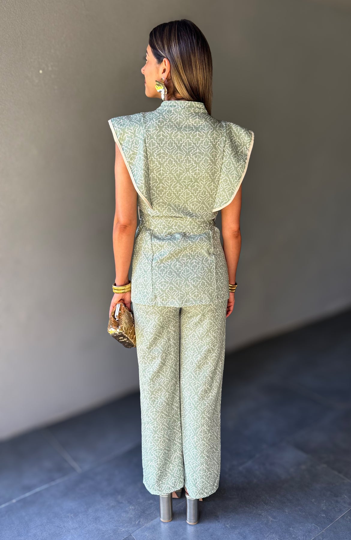 Conjunto de camisa e calça. Camisa sem mangas com botões frontais e cinto do mesmo tecido, e calças de corte reto com bolsos à frente. O tecido tem elasticidade leve, garantindo conforto e estrutura. Ideal para um look elegante, feminino e marcante.