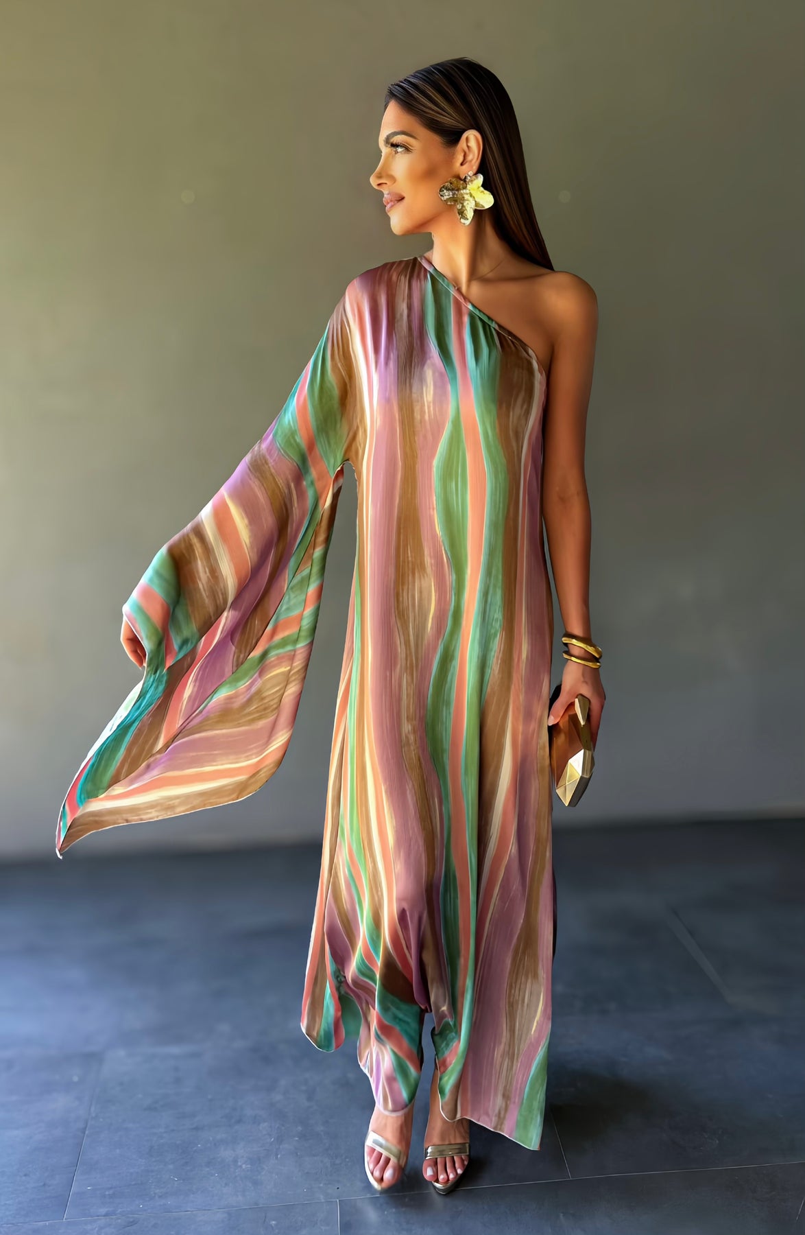 Vestido maxi fluido com manga assimétrica, envolve o corpo com leveza e personalidade. A modelagem ampla e o tecido leve proporcionam conforto e movimento, realçando a silhueta com elegância. Uma peça versátil para quem busca autenticidade e sofisticação em cada detalhe.