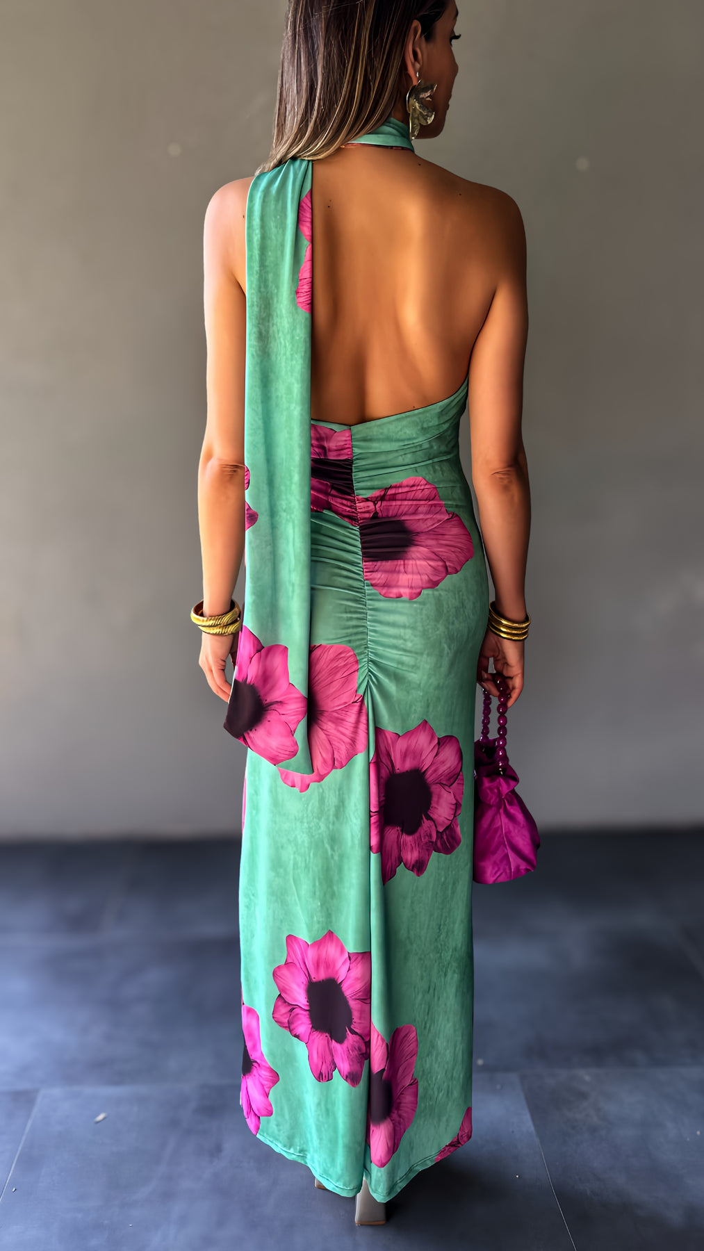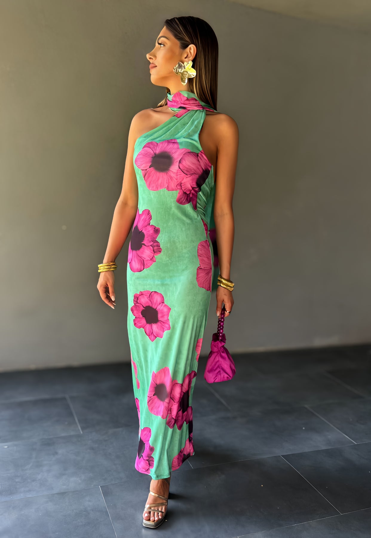 Vestido midi de um ombro só com estampado floral em cores vibrantes. O tecido leve e com elasticidade suave adapta-se ao corpo e valoriza a silhueta. O drapeado nas costas e a alça larga que pode ser usada de diferentes formas dão um toque sofisticado e original à peça.