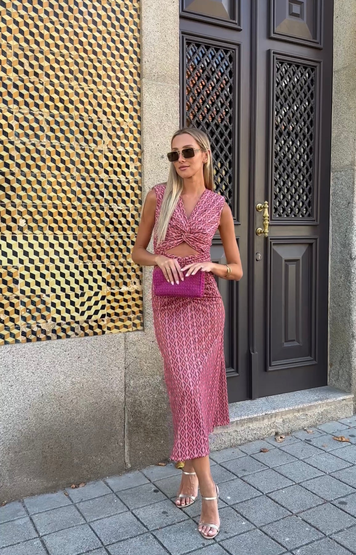 Vestido de decote em V, nó na zona do abdómen com abertura, e estampado sobre tecido brilhante.