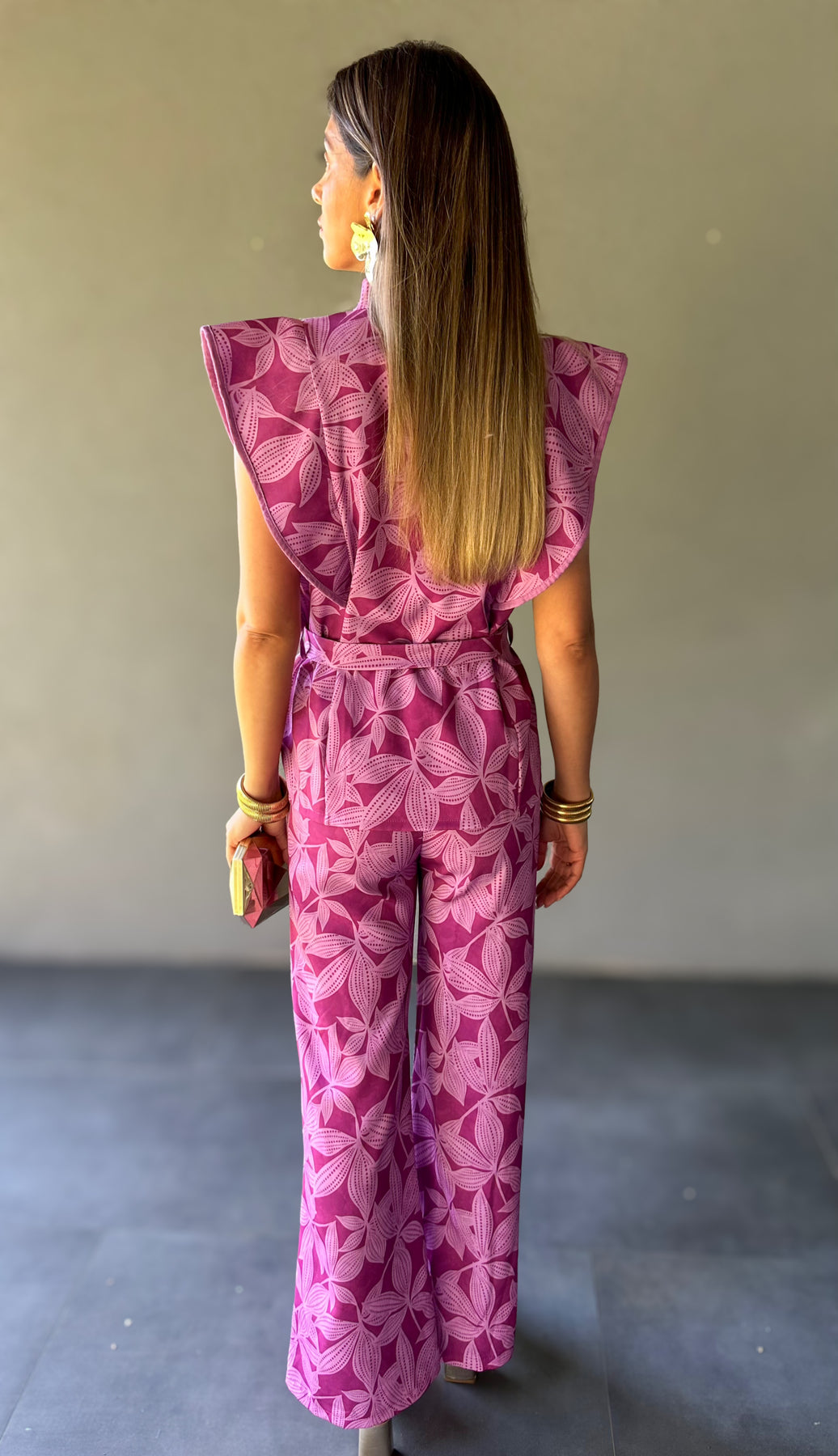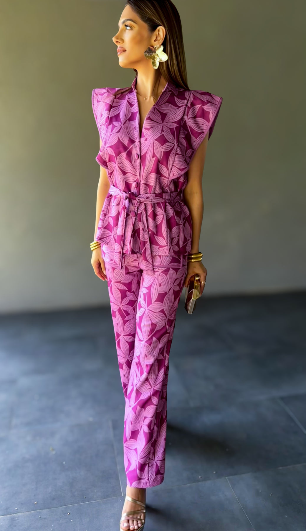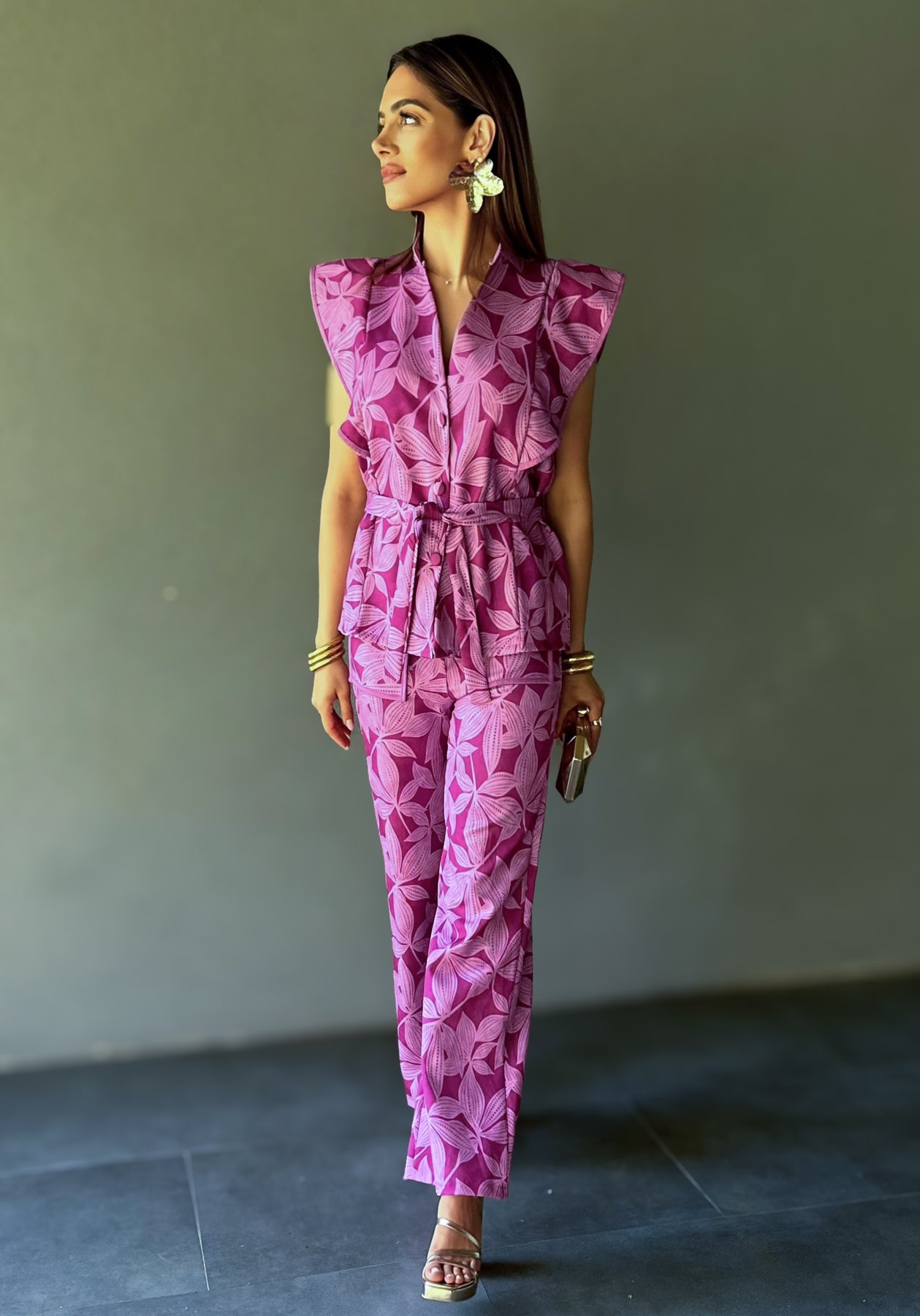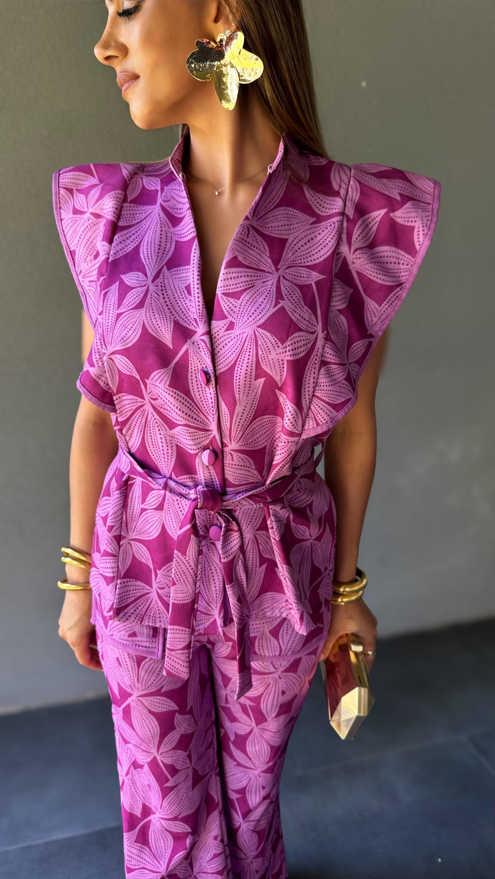 Conjunto de camisa e calça. Camisa sem mangas, ombros estruturados, com botões frontais e cinto de mesmo tecido. As calças de corte reto possuem bolsos frontais e caimento leve. Confeccionado em tecido confortável com toque macio e elasticidade suave.